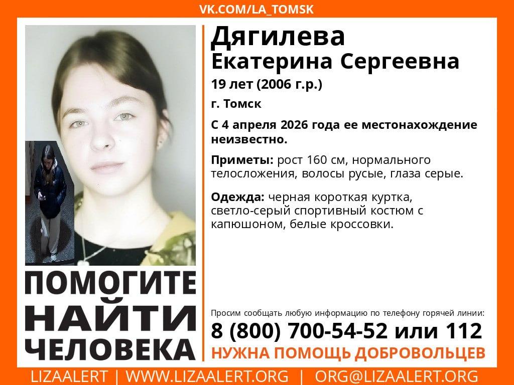 Волонтеры томского поискового отряда «ЛизаАлерт» сообщили об исчезновении 19-летней Екатерины Дягилевой. С 4 апреля 2026 года о ее местонахождении ничего не известно.