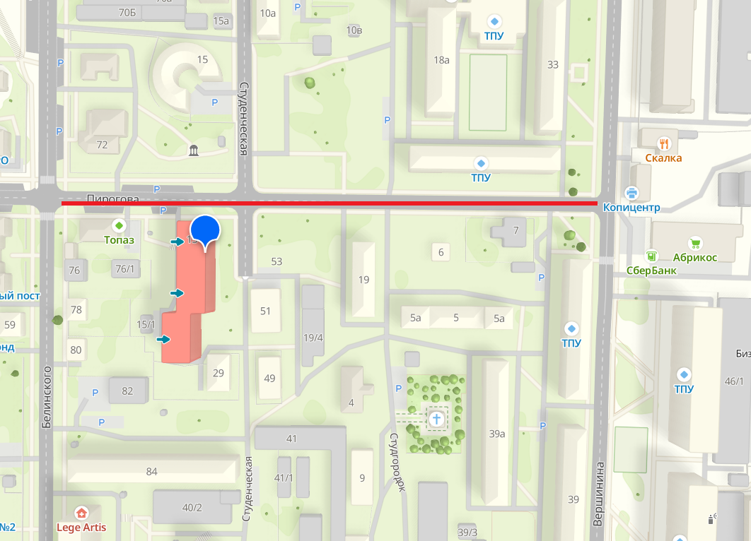 Карта с отмеченным участком перекрытия на улице Пирогова.